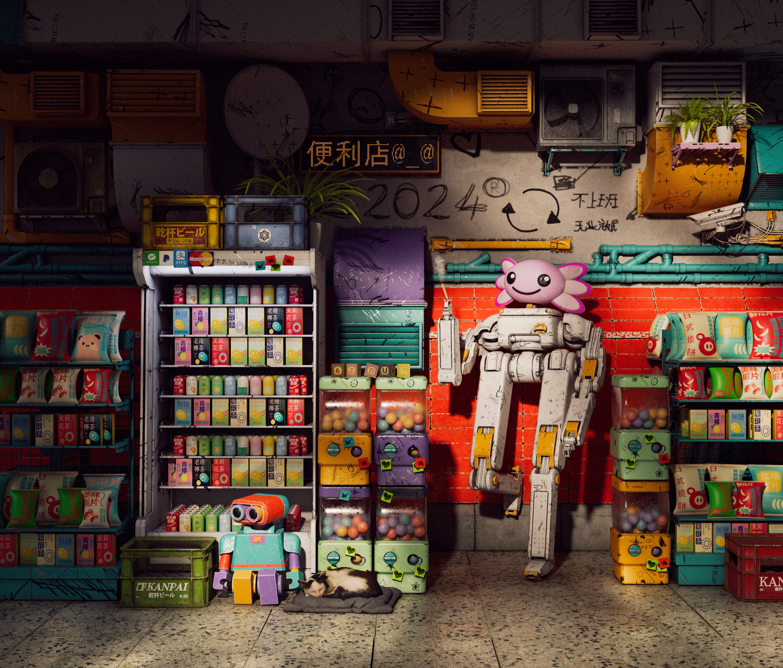 A fully self-initiated worldbuilding project, The Forgotten Bots is a retro-futuristic interpretation of a convenience store set in a moody near-future. I led every aspect of this work—from concept development and character design to modeling, texturing, shading, lighting, and final rendering. The project reflects my passion for crafting rich visual narratives and immersive environments, blending speculative design with grounded, tactile realism. This piece serves as an exploration of storytelling through design, evoking atmosphere, culture, and personality through minute details and art direction.